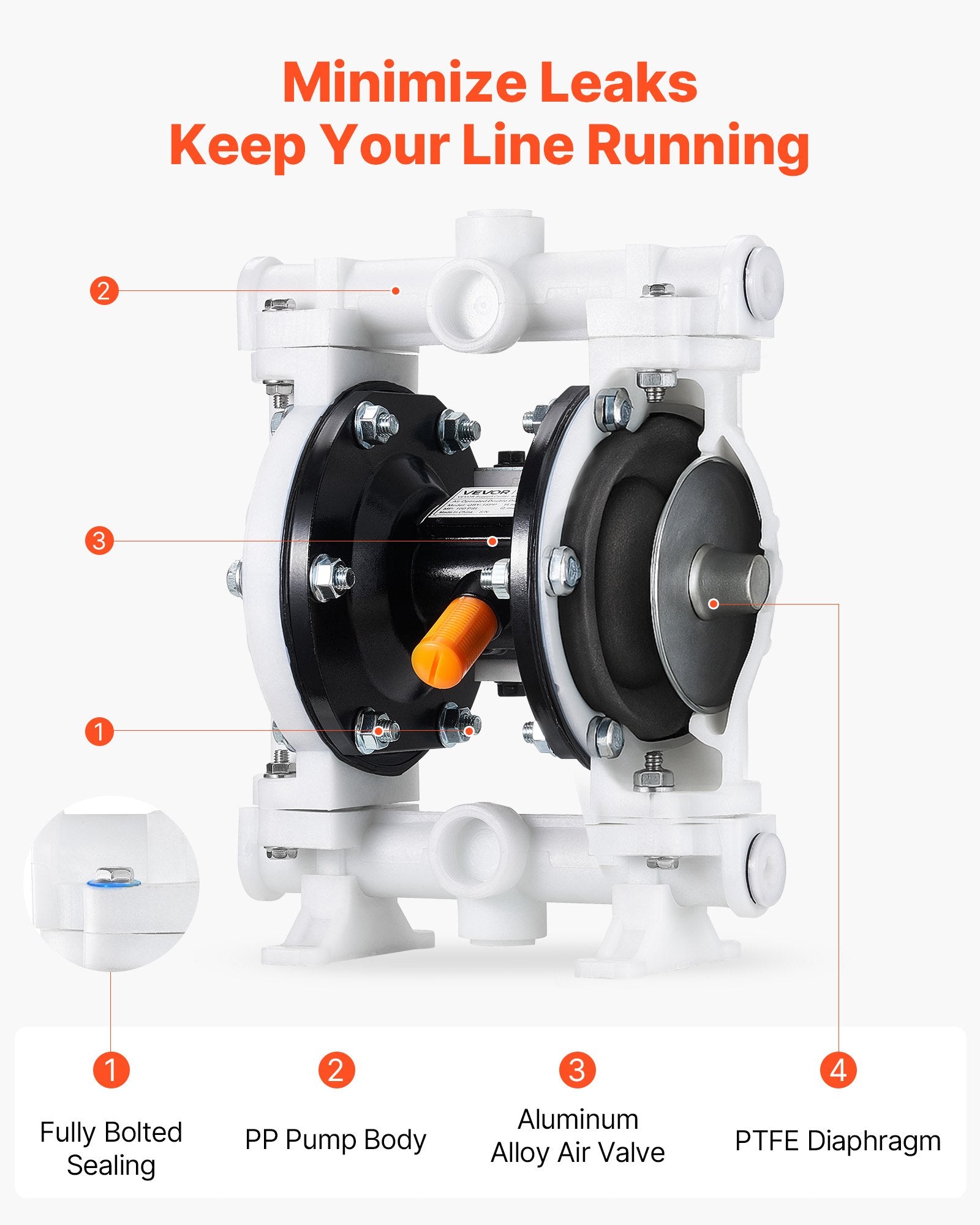 - Durable & Leak-Proof: Equipped with a PP pump body and PTFE diaphragms for heat and corrosion resistance. This air operated diaphragm pump features a full-bolt structure for a secure seal. Built for long-term use, it runs dry without damage