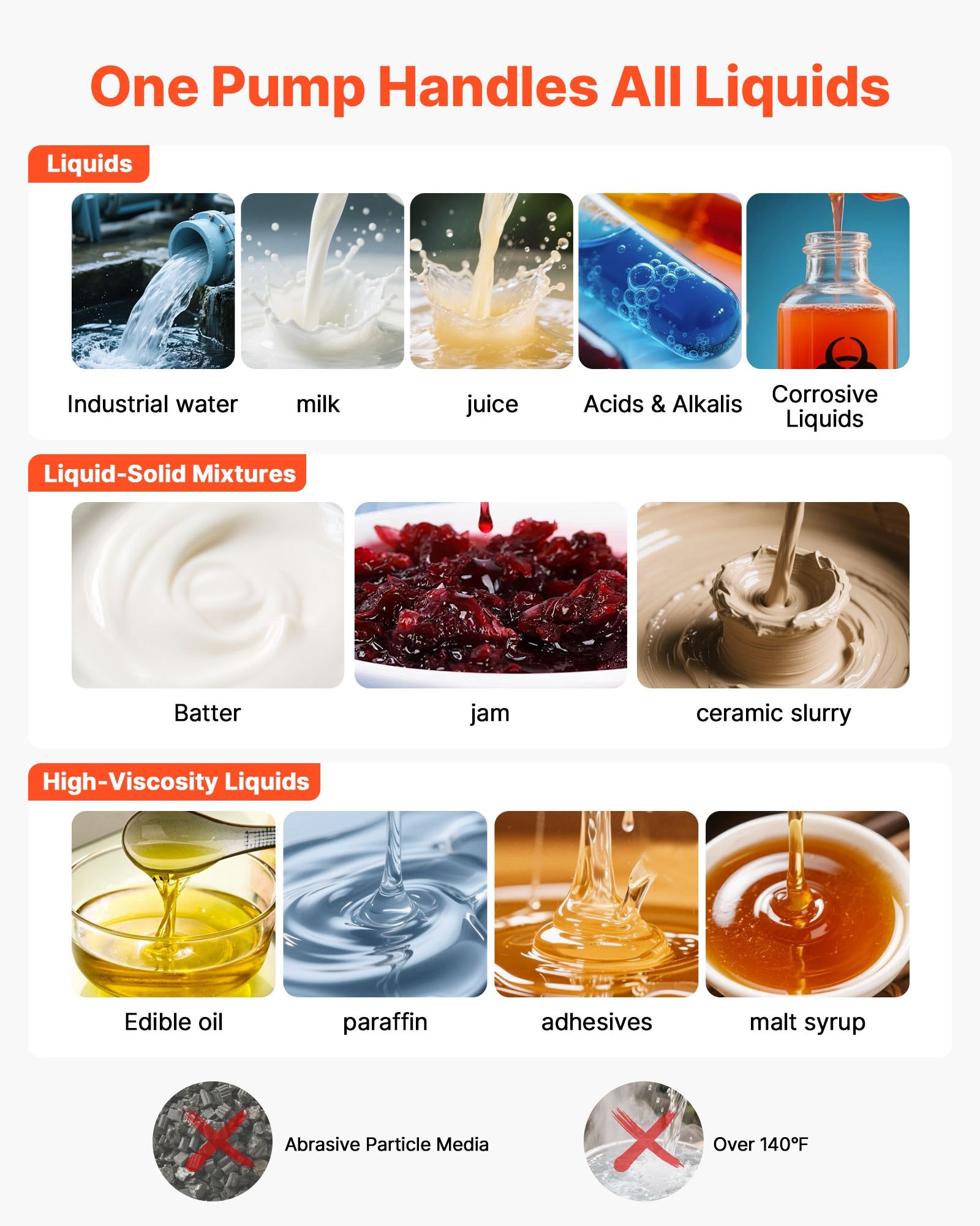 - Versatile Liquid Handling: This pneumatic transfer pump handles waste oil, hydraulic oil, gasoline, diesel, detergents, and even beverages. Works with acidic and alkaline liquids, but not recommended for abrasive media or liquids above 140℉/60℃