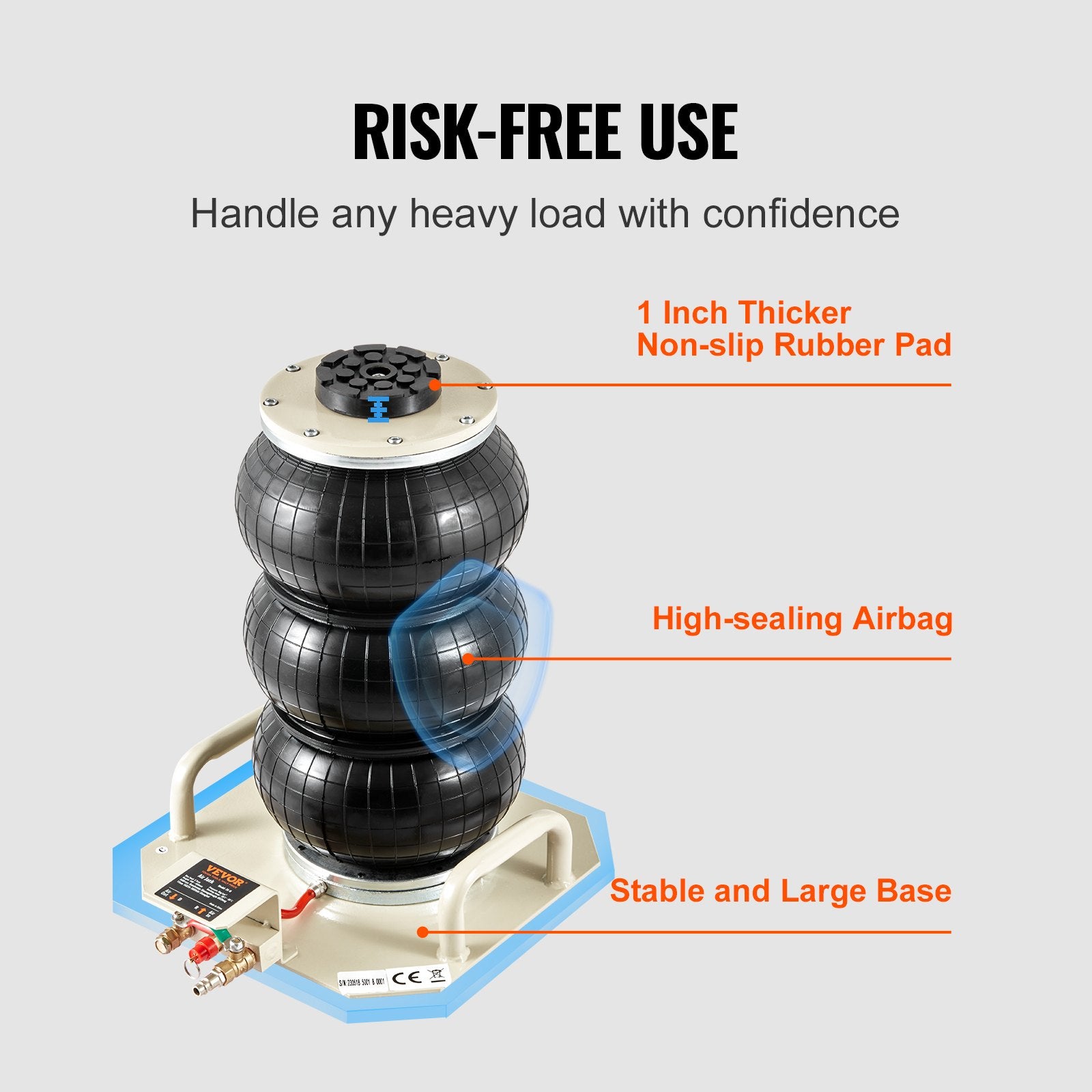 - Smooth and Reliable Operation: Say goodbye to frustrating jams! Our triple bag jack utilizes six steel pipes, strategically optimized for height and structure. This scientific design enhancement ensures exceptional stability, even when lifting heavy vehicles. Experience seamless lifting without any annoying setbacks.