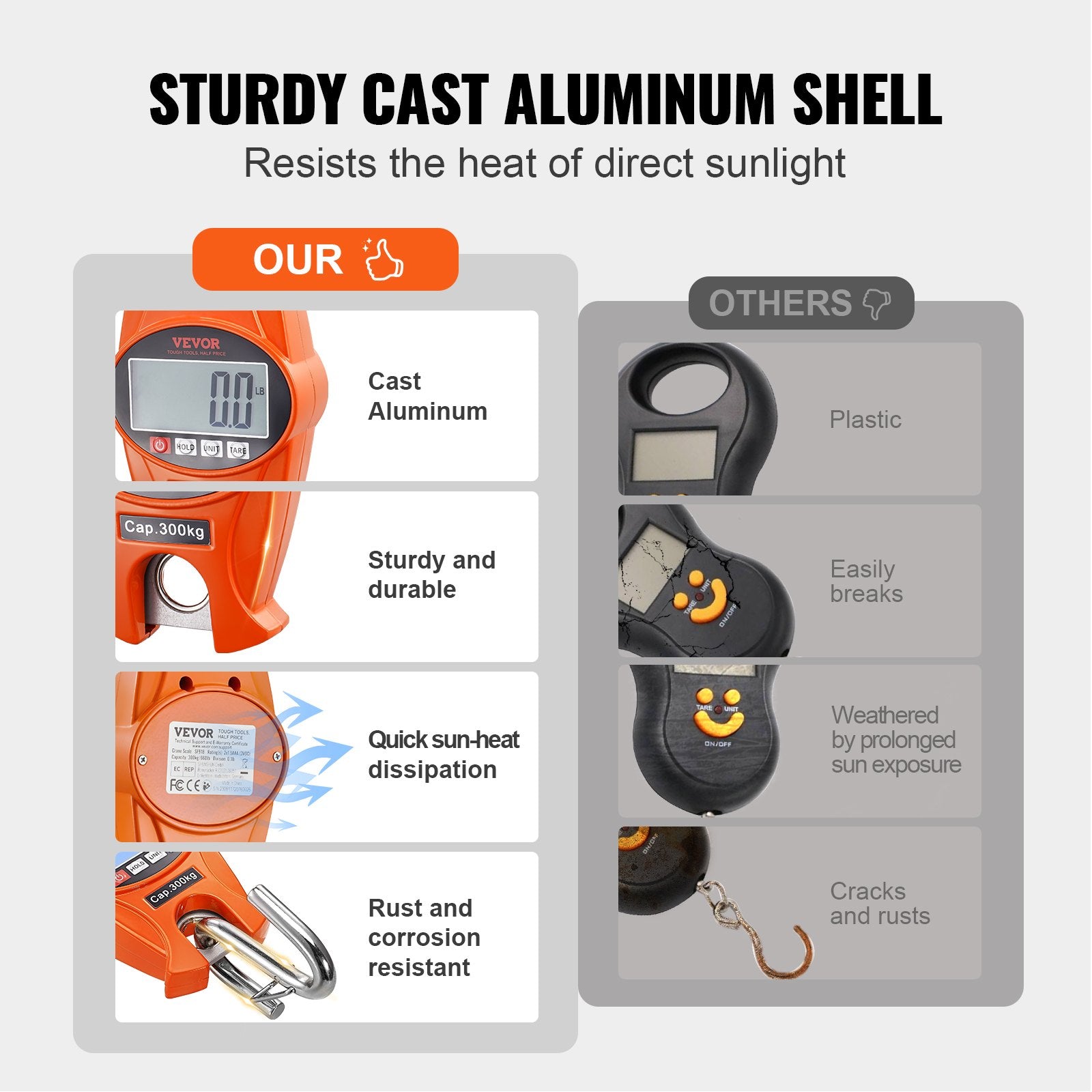 Digital Crane Scale, 660 lbs/300 kg, Industrial Heavy Duty Hanging Scale with Cast Aluminum Case & LCD Screen, Handheld Mini Crane with Hooks for Farm, Hunting, Fishing, Outdoor, Garage (Orange)
