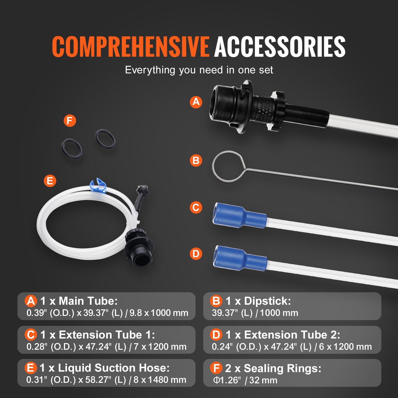 - Thorough Fluid Extraction: With four sizes of suck-it-all-up oil extractor tubes, you're reaching the deepest depths, leaving tanks dry. Main Tube: 9.8" x 39.37" / 249 x 1000 mm; Extension Tube 1: 0.28" x 47.24" / 7 x 1200 mm; Extension Tube 2: 0.24" x 47.24" / 6 x 1200 mm; Suction Hose: 0.31" x 58.27" / 8 x 1480 mm.