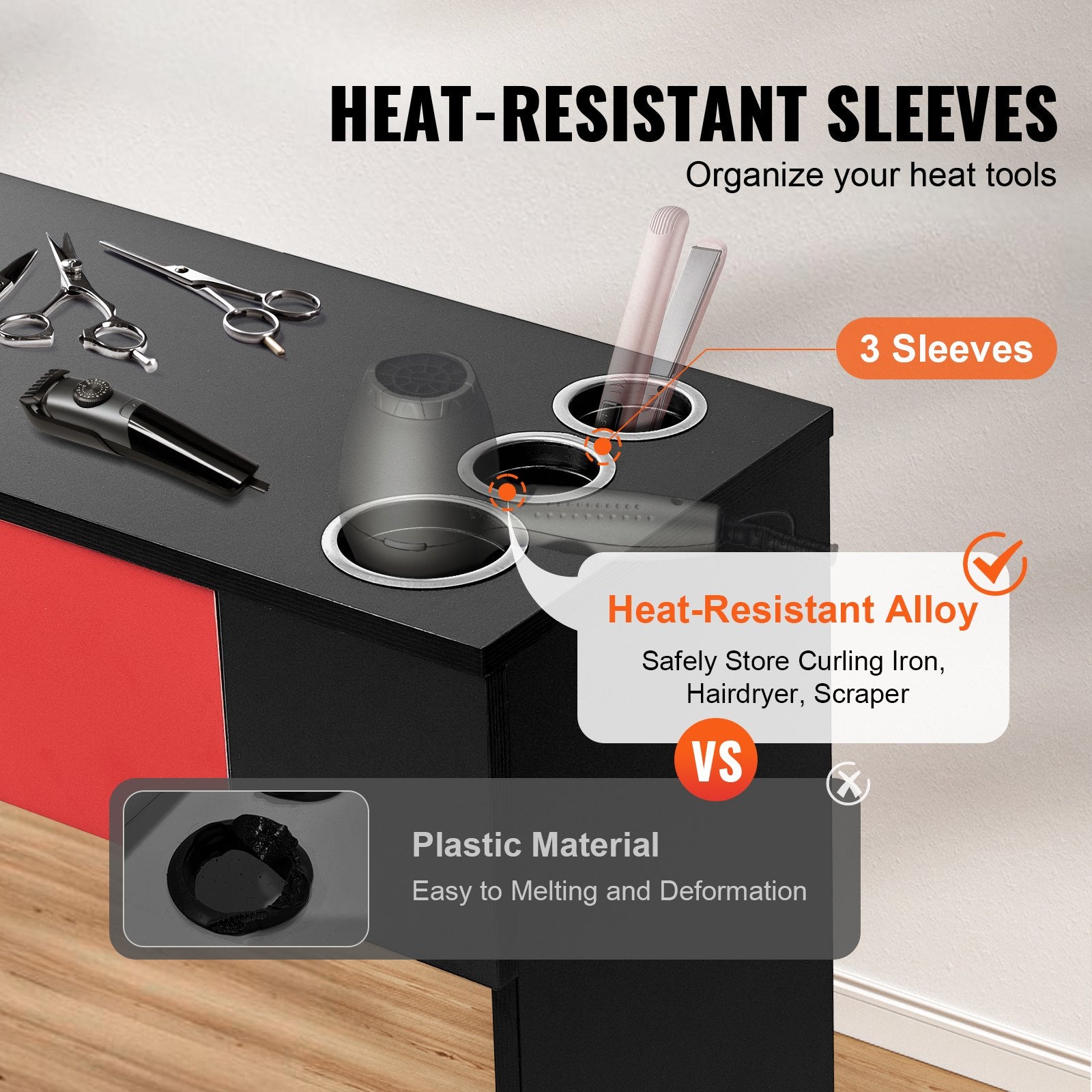 - Heat-Resistant Tool Sleeves: Made of heat-resistant alloy material, the hair styling salon station provides three heat tool sleeves with a bottom cover design to prevent tools from falling, ensuring safety during use.