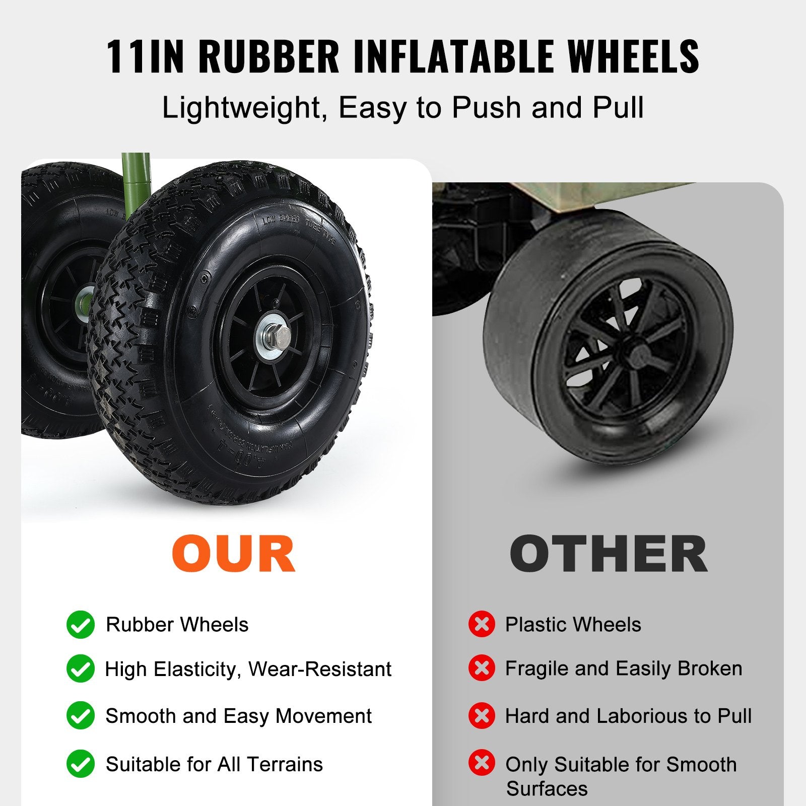 - Practical Inflatable Wheels: This fishing beach cart is outfitted with 11-inch rubber inflatable wheels that glide over mud, gravel, and grass like a dream. These wheels don't just carry your load; they make your journey to the perfect fishing spot as smooth as your favorite fishing line.
