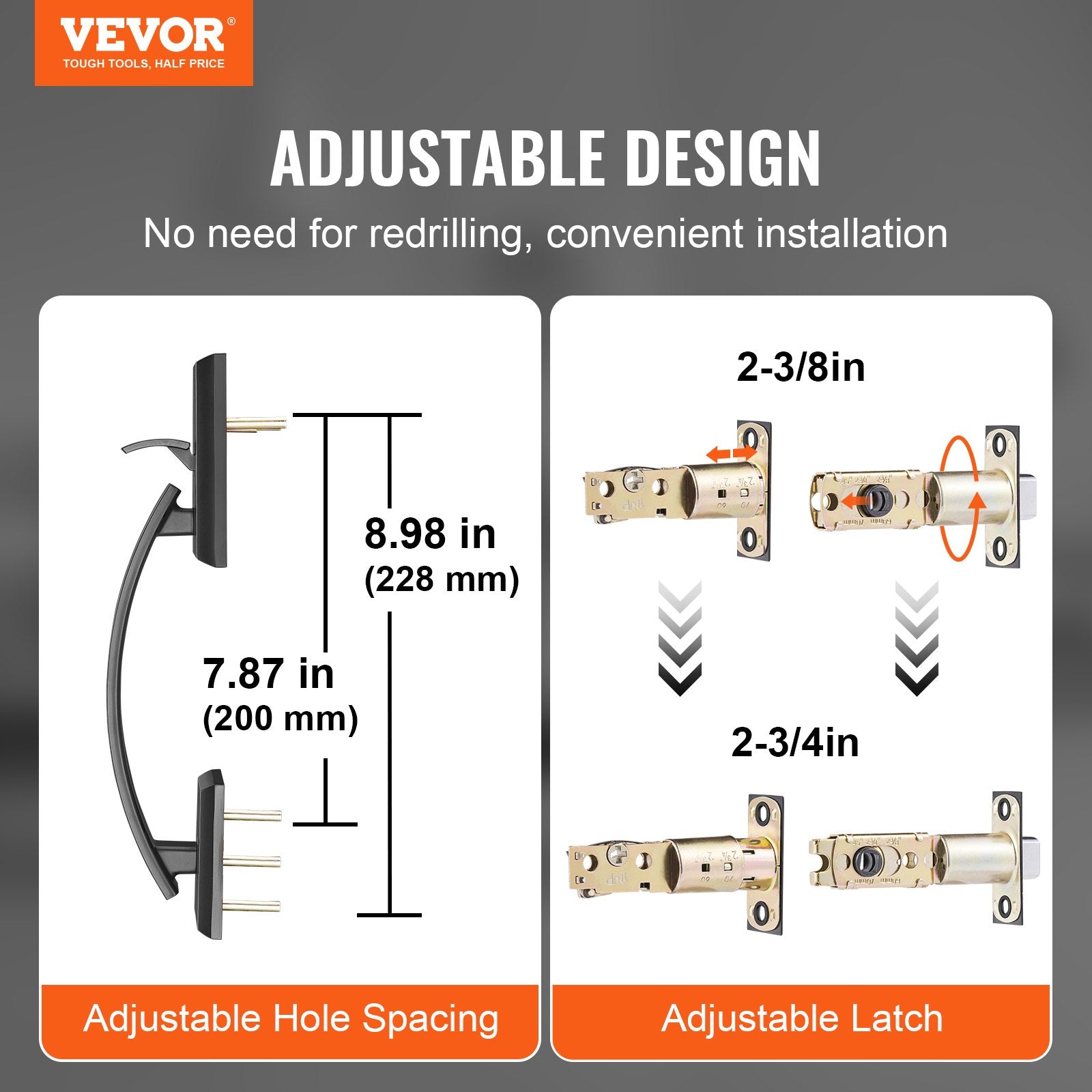 - Adjustable Hole Spacing: The external handle's hole spacing is adjustable, ranging from 7.87" to 8.98". There is no need to redrill. You can utilize existing holes for easy installation. It is perfect for replacement needs. The double door handle set combines style and durability, serving not only as functional hardware but also as an elegant decoration suitable for front doors, rear doors, or office doors.