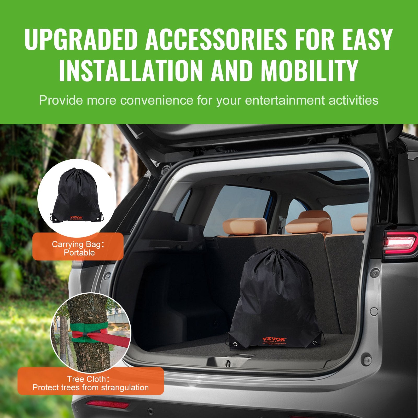- Upgraded Accessories: This zip lines for kids and adults includes everything you need. It adds a portable bag for easy storage and mobility. It comes with two tree protectors to prevent damage to trees, also serving as slack line protectors for increased durability. The tensioner effortlessly tightens and secures the straps with simple operation.