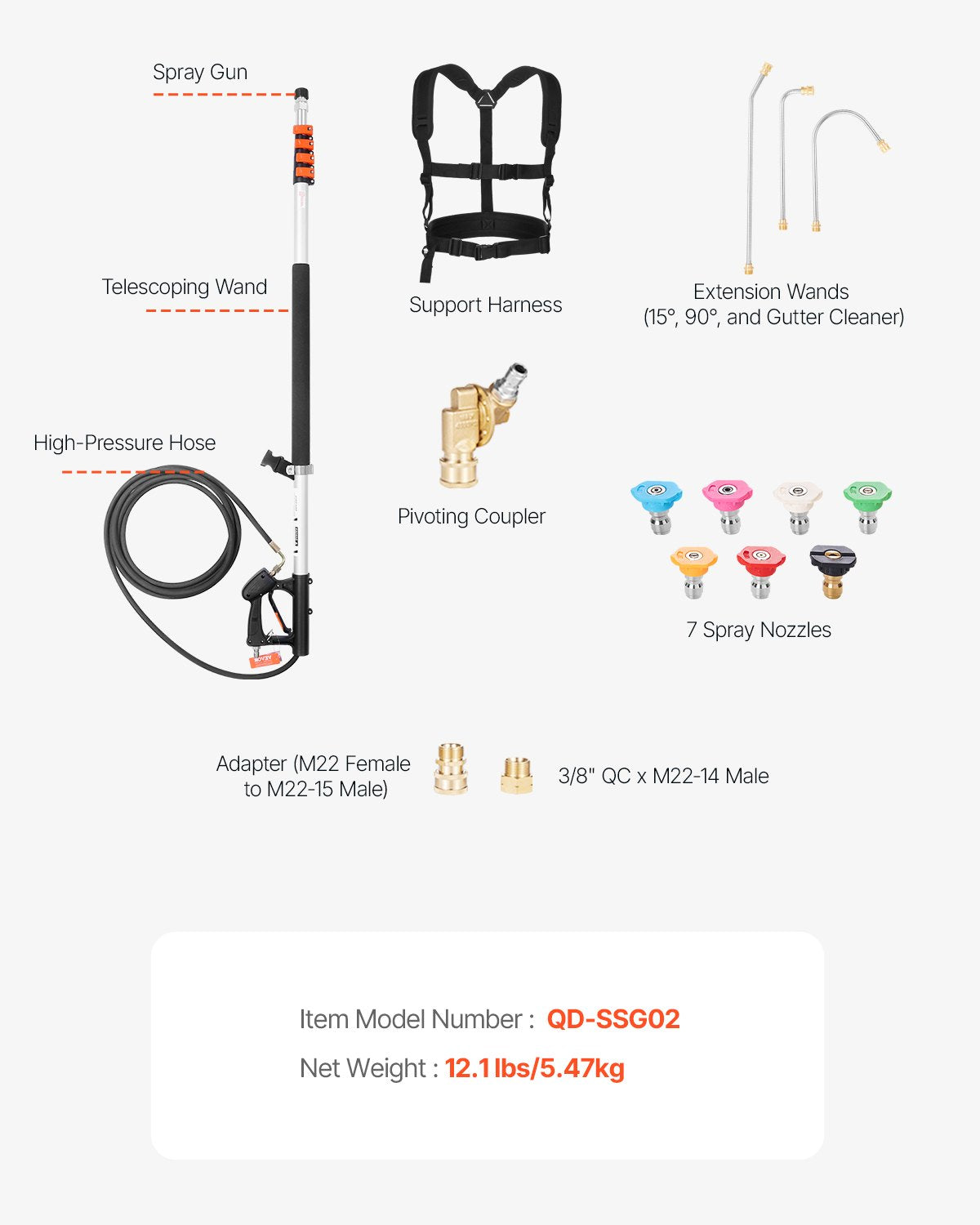 - Versatile Attachments: This telescoping pressure washer wand includes a comprehensive set of cleaning accessories: 3 extension wands (15°, 90°, and gutter cleaner), 7 spray nozzles (3 x 0°, 15°, 25°, 40° and foam nozzle) and a pivoting coupler. These versatile attachments enable flexible operation at various heights and distances, ideal for cleaning high or hard-to-reach areas.