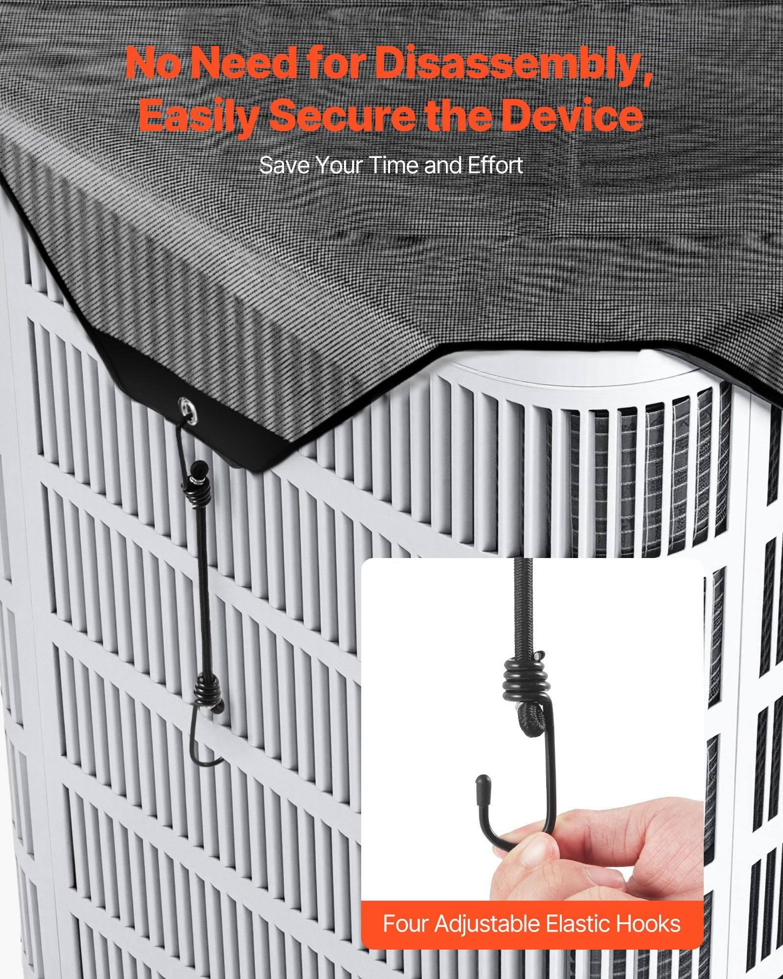 - Easy Installation: The air conditioner cover features four adjustable elastic hooks, allowing easy attachment without moving the unit. The hooks adjust to fit the device size, ensuring a secure fit. Simple and quick installation saves time and effort