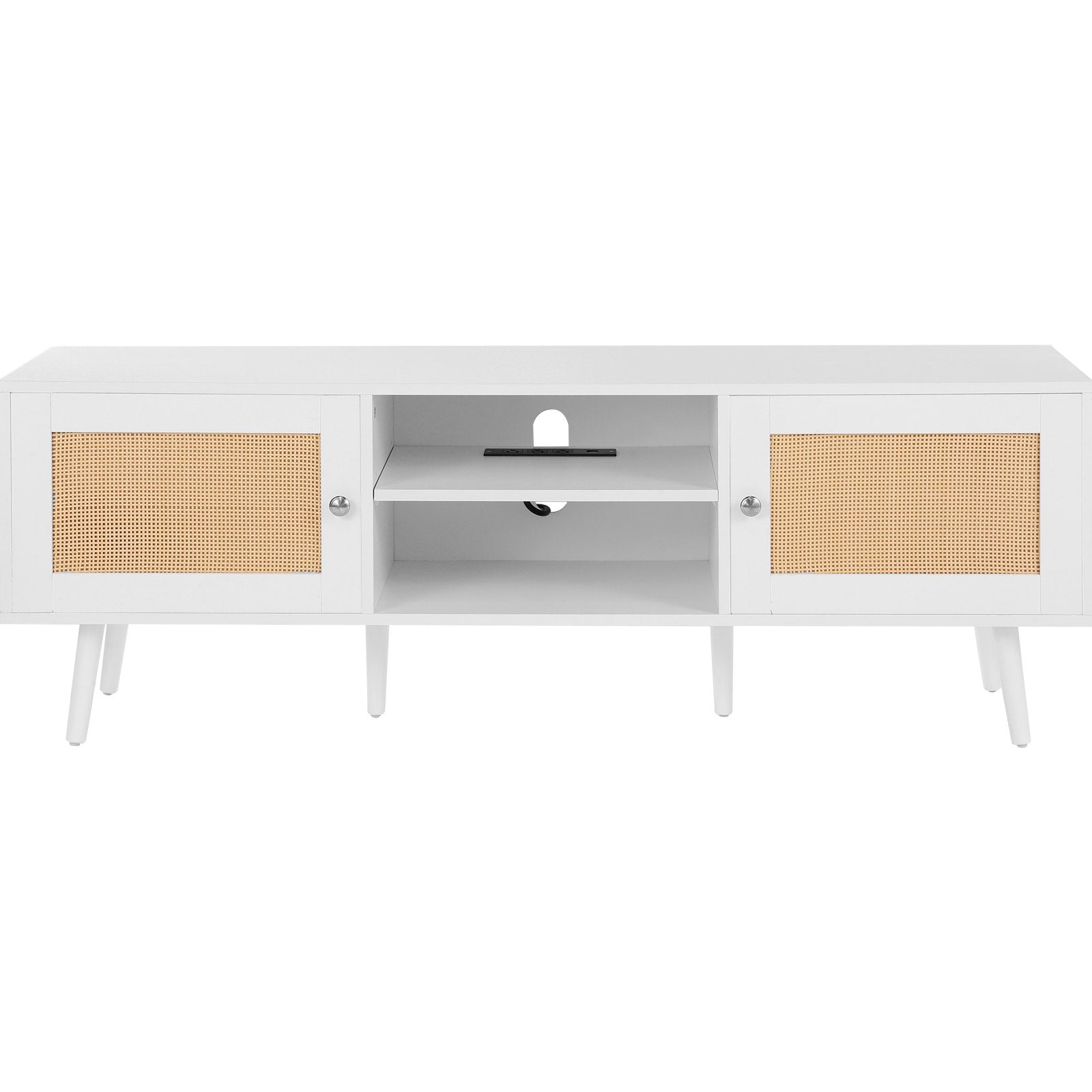 Rattan TV Stand for 65 inch TV, Boho TV Stand with Rattan Door, Entertainment Center with Build-in Socket and USB Ports, Modern TV Console for Living Room, Media Room, White