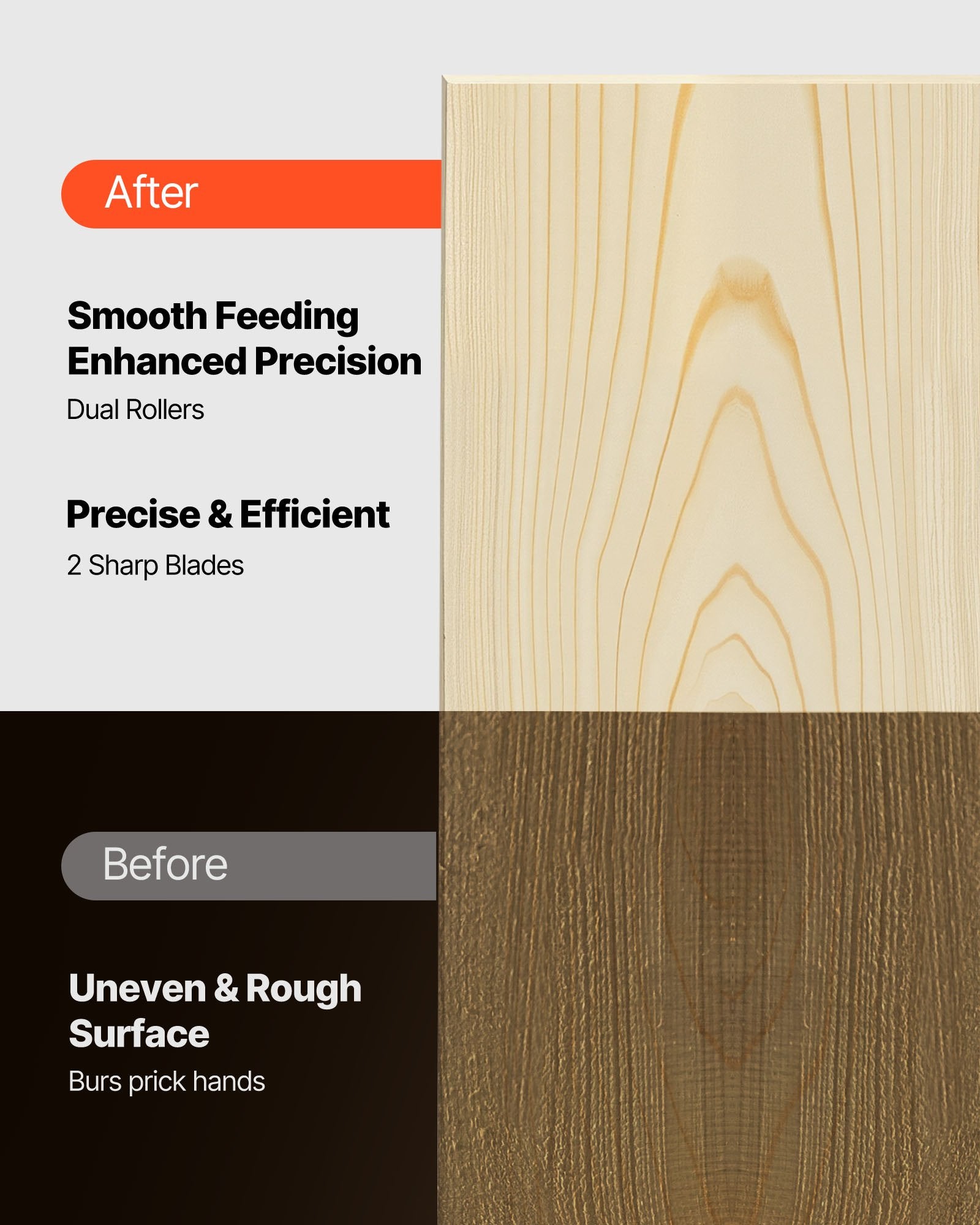 - Dual-Roller Feeding System: Sturdy dual rollers advance boards with precision, reducing vibration and alignment issues for flawlessly straight cuts. Paired with two sharp HSS blades, this thickness planer delivers glass-smooth edges free of splinters