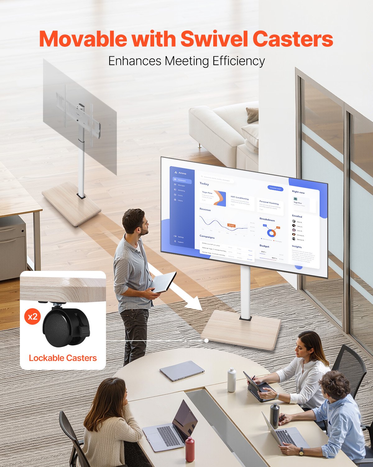 - Convenient Mobility: Equipped with swivel wheels, this mobile TV mount allows you to effortlessly rotate to adjust angles or move it to your desired position. You can easily slide it to different spots in the room.