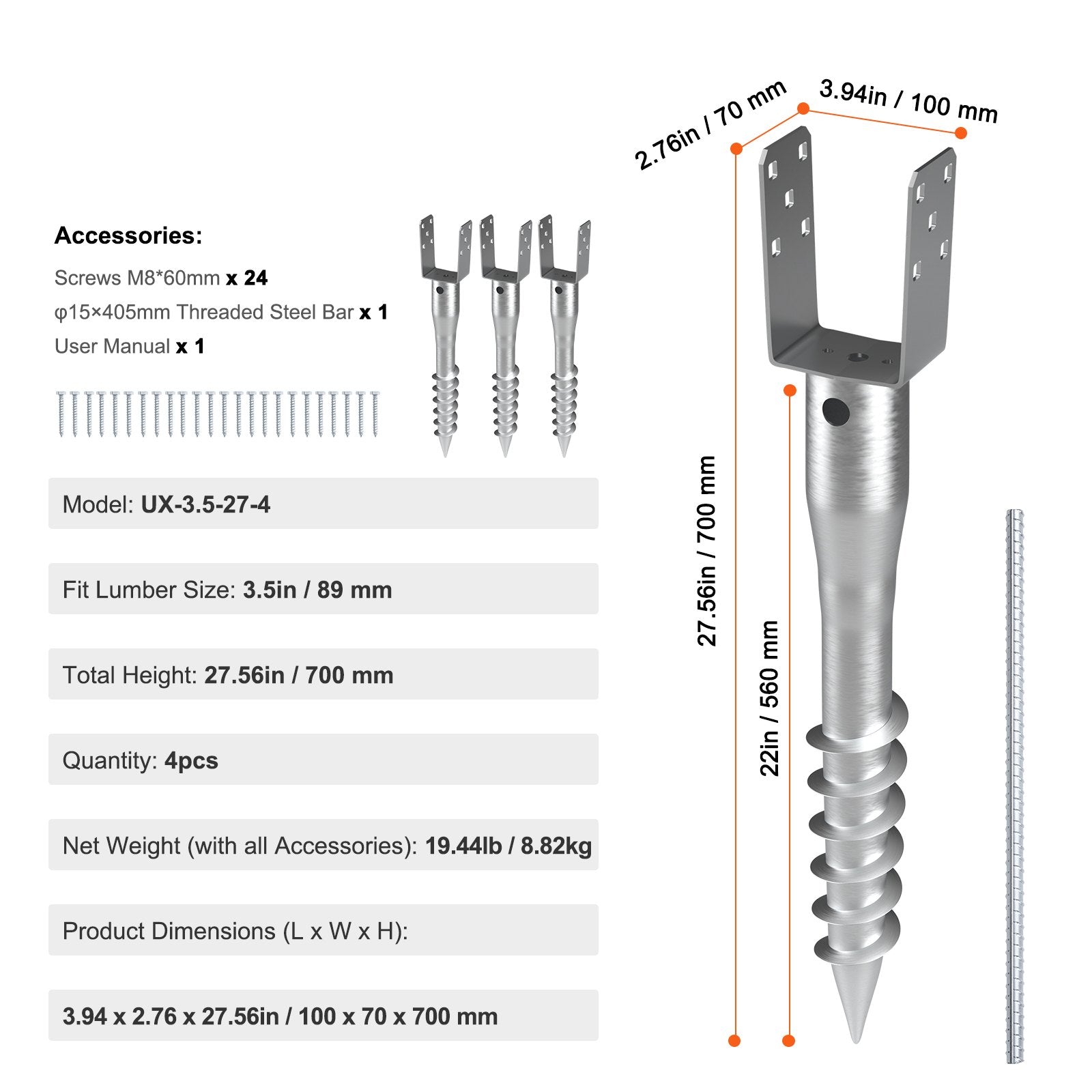 - Suitable for 3.5” Timber: The semi-enclosed spike has a total height of 27.56 inches and a nail length of 22 inches, suitable for 3.5-inch timber, providing excellent support.