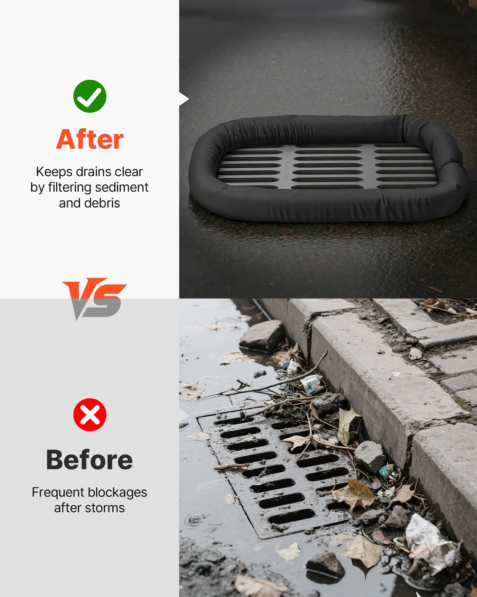 - Flexible & Adaptable: Soft and flexible, storm drain filter sock easily bends to fit irregular surfaces like grass, curves, and slopes, ensuring effective sediment capture.