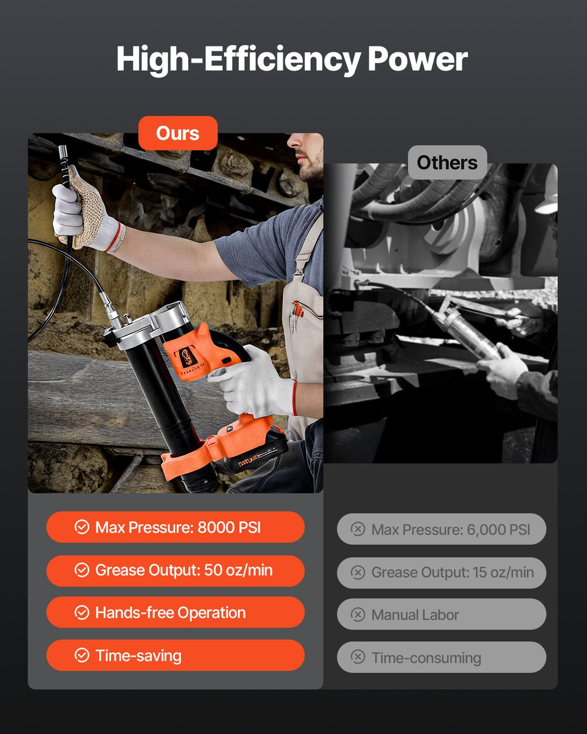 - High-speed Greasing: No more manual pumping! This automatic grease gun delivers 50oz per minute at 8000 PSI, making lubrication fast and easy. The variable-speed trigger gives precise control, so you apply just the right amount—no waste, no mess