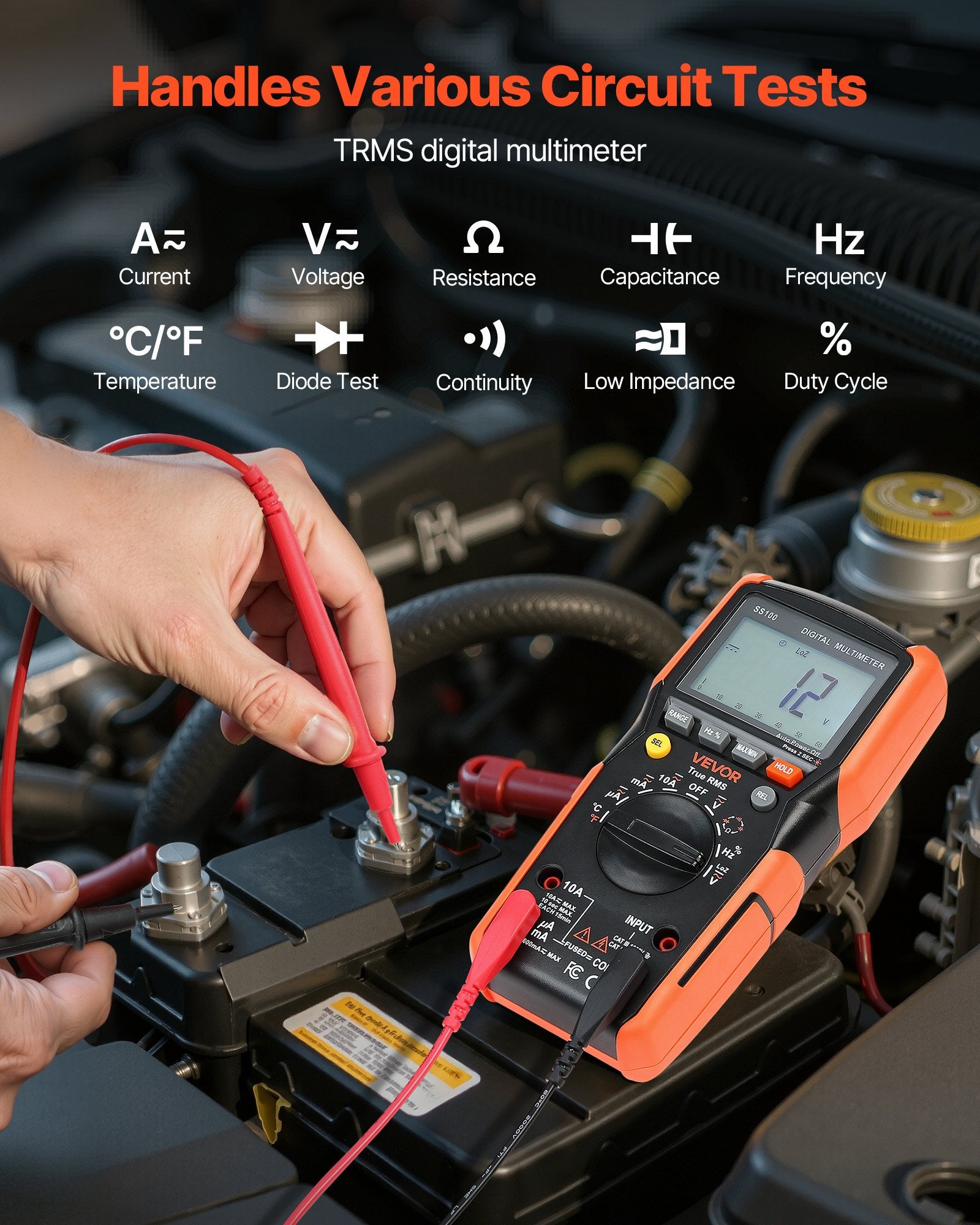 - All-in-One Functionality: This digital TRMS multimeter supports DC/AC voltage, current, resistance, capacitance, frequency, temperature, diodes, continuity, low impedance, and duty cycle testing — offering comprehensive electrical measurements for home DIYers and professionals