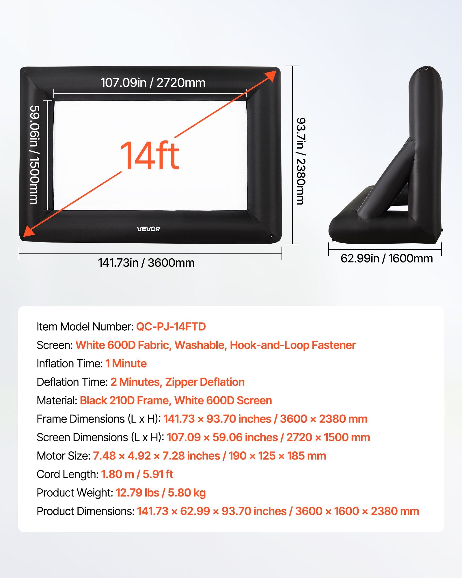 14 ft Inflatable Movie Screen, 600D Washable Inflatable Projection Screen with Portable Storage Bag, Easy Set Up 16:9 Movie Projector for Outdoor Backyard, Home Theater, Theme Party, Pool Fun