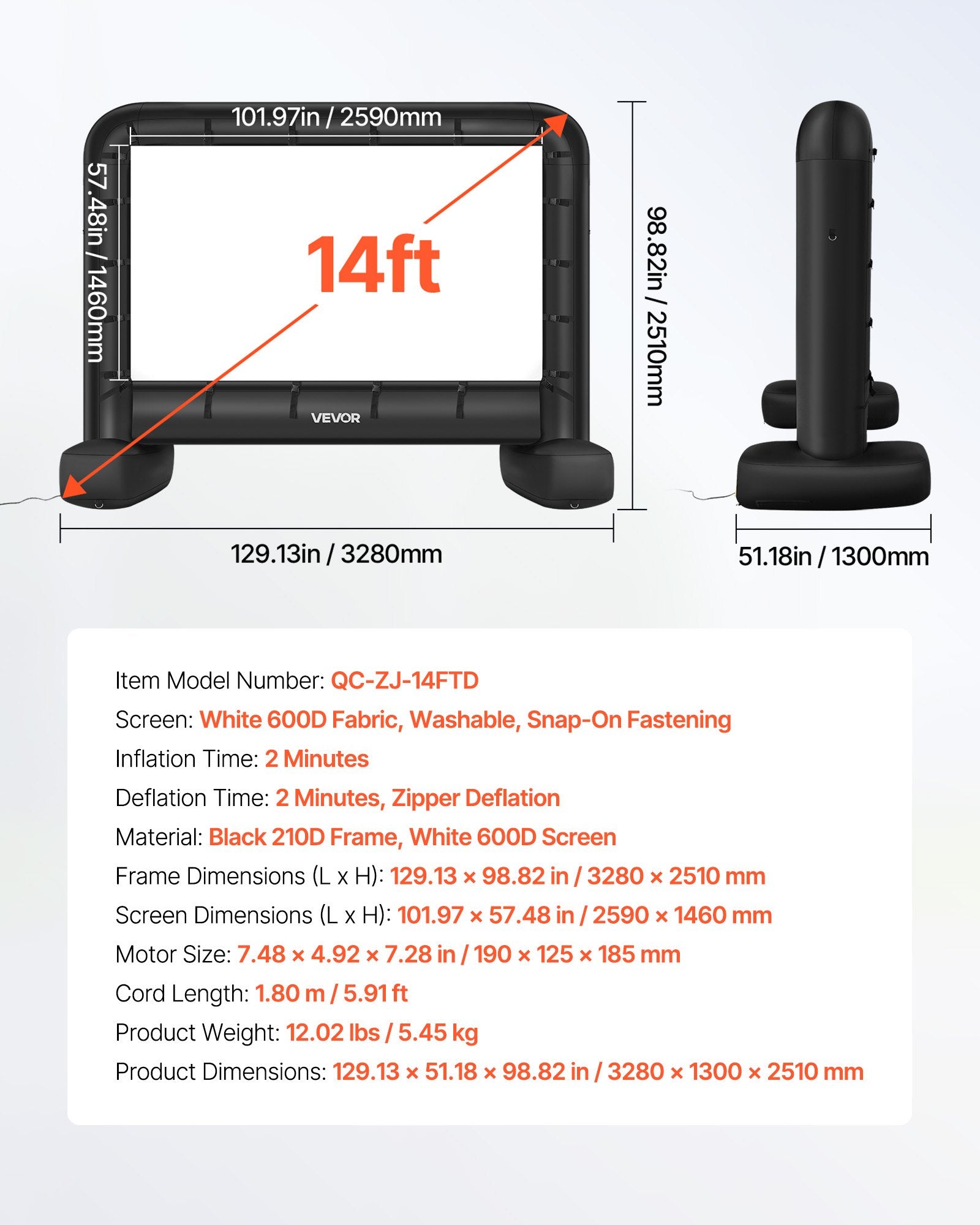 14 ft Inflatable Movie Screen, 600D Washable Inflatable Projector Screen with Portable Storage Bag, 16:9 Easy Set Up Movie Projection for Outdoor Backyard, Home Theater, Theme Party, Pool Fun