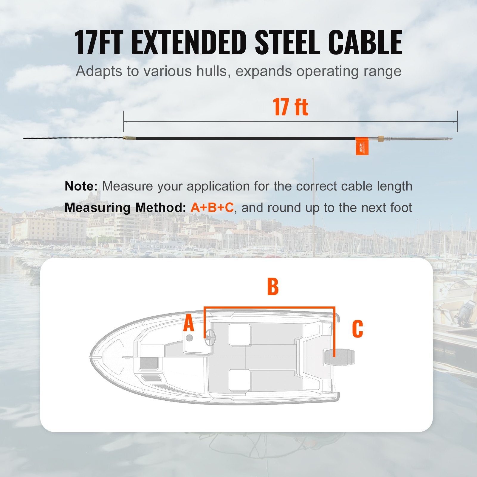 - Extended 17ft Steel Cable: Our boat steering cable has upgraded to a 17ft/5200±50 mm length for flexible installation across various hull types, providing larger operational space and ease of steering control compared to traditional cables on the market.