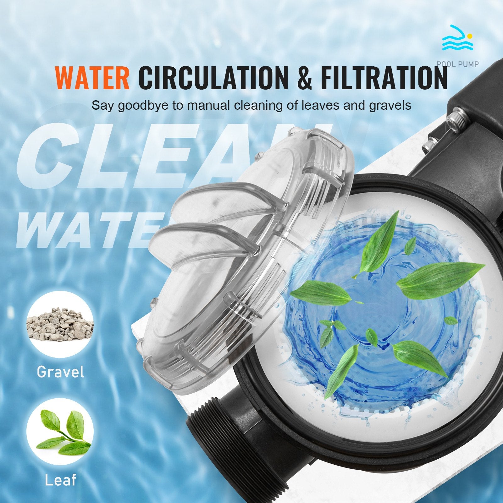 - Efficient Water Circulation System: With an 100 GPM Max. Water Flow and 15 m Max. Head lift, our pool pump ensures rapid water circulation. Its detachable filter basket, compatible with a sand filter (not included), facilitates physical purification and keeps your pool water crystal clear. The PVC cover allows you to monitor accurately when the basket needs cleaning. Enjoy consistently pristine pool bottoms every time!