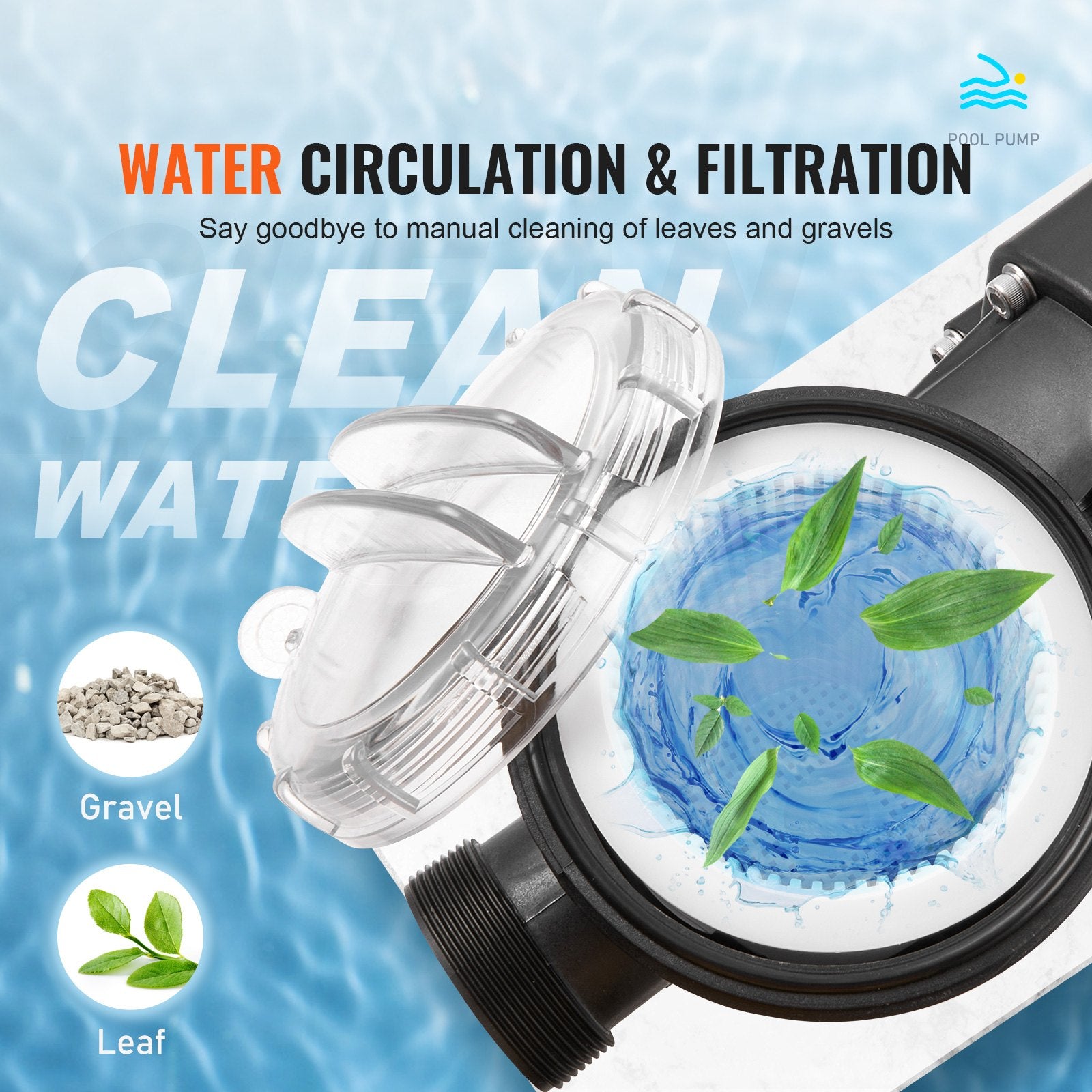 - Efficient Water Circulation System: With an 115 GPM Max. Water Flow and 15 m Max. Head lift, our pool pump ensures rapid water circulation. Its detachable filter basket, compatible with a sand filter (not included), facilitates physical purification and keeps your pool water crystal clear. The PVC cover allows you to monitor accurately when the basket needs cleaning. Enjoy consistently pristine pool bottoms every time!