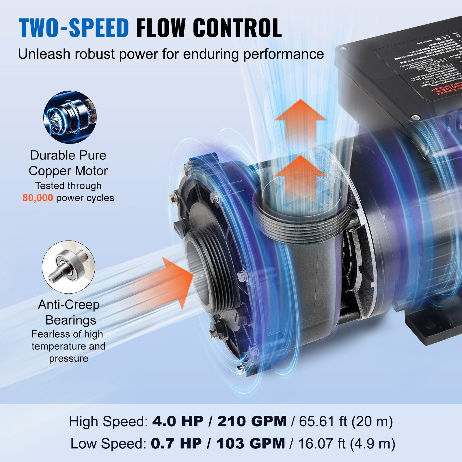 2 Speed SPA Pump, 56-Frame, Dual-Speed Hot Tub SPA Pump, 1900W / 43 m³/h / 18 m High Speed or 450W / 21.5 m³/h / 4.4 m Low Speed, 2" Port 90° Rotational Interface for Hot Tub, TÜV Certification