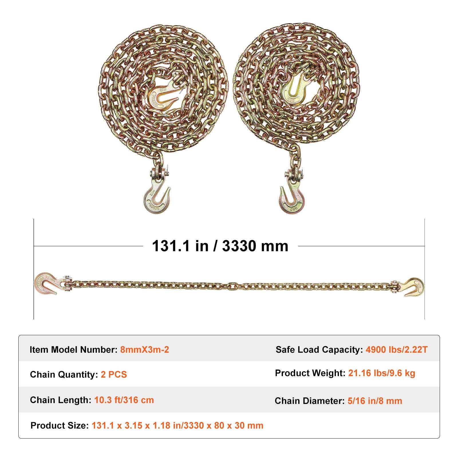 G80 Transport Binder Chain, 5/16" x 10.3' 2-Pack Tow Chain with Clevis Grab Hooks, 4900 lbs Safe Working Load, Heavy Duty Logging Chain for Transporting Towing Truck Tie Down Binding Equipment