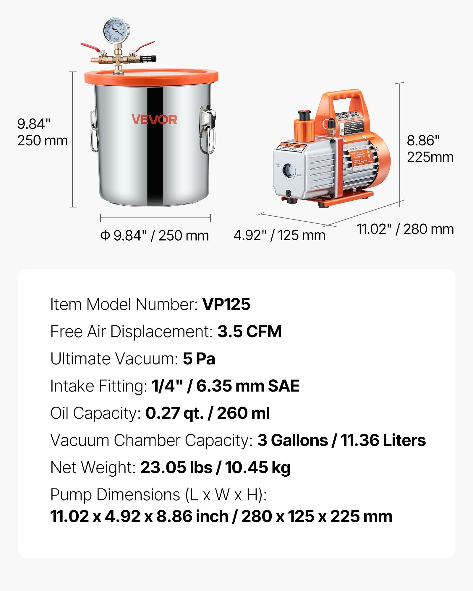 - Everything You Need: This kit includes a vacuum pump, an 11.36 L vacuum chamber, a tempered glass lid, a vacuum gauge set, a red & blue manual shut-off valve, a 4.92 ft hose, a silicone pad, and a bottle of 0.35 qt (330 ml) vacuum pump oil